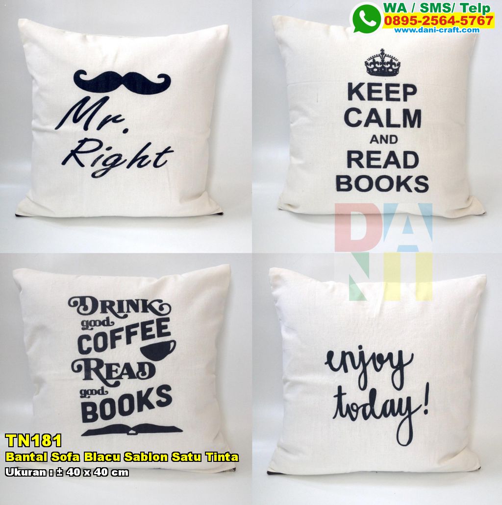 Jual Bantal Sofa Blacu Sablon Satu Tinta harga grosir. Kode barang ini adalah TN181. Produk ini menggunakan bahan Kain Blacu dan Dakron. Adapun ukurannya yaitu kisaran 40 x 40 cm
