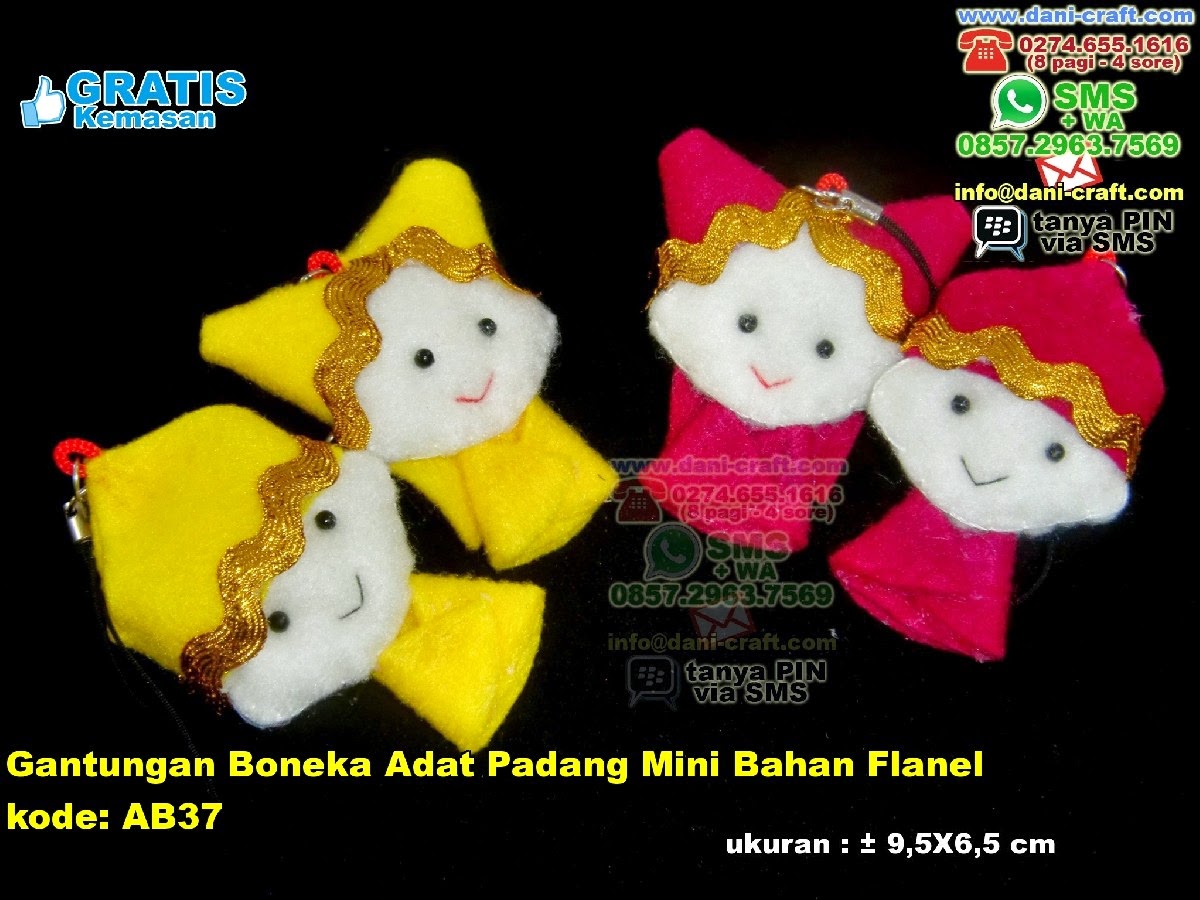 Gantungan kunci boneka pengantin ini terdiri dari sepasang boneka laki-laki dan perempuan berpakaian adat khas dari Padang Sumatera Barat. Desain dan bentuk boneka kecil yang menawan serta warna pakaian boneka yang cantik mencolok akan membuat orang senang untuk menerimanya. Para tamu undangan anda tidak mungkin akan berani menyia-nyiakan souvenir boneka pengantin adat Padang yang berbentuk gantungan kunci ini karena sekilas saja kelucuan boneka ini langsung bisa memenangkan hati orang yang memilikinya. Hiasan flanel memang bervariasi tetapi kreasi kain flanel yang paling bisa mengambarkan momen bersejarah dalam hidup sesuai budaya yang mungkin anda miliki hanyalah boneka pengantin adat Padang ini.