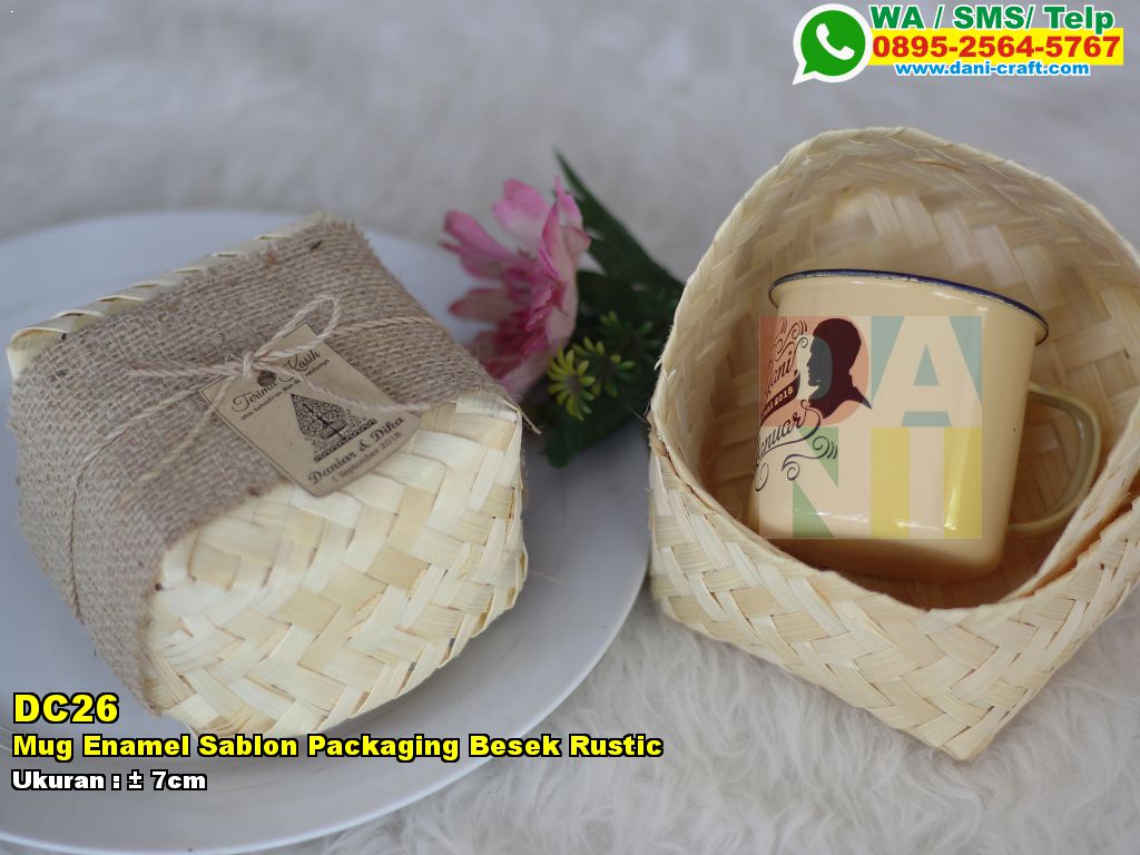Harga Mug Enamel Sablon Packaging Besek Rustic murah. Kode produk ini yaitu DC26. Produk ini menggunakan material kaleng. Adapun dimensinya yaitu kisaran 7cm