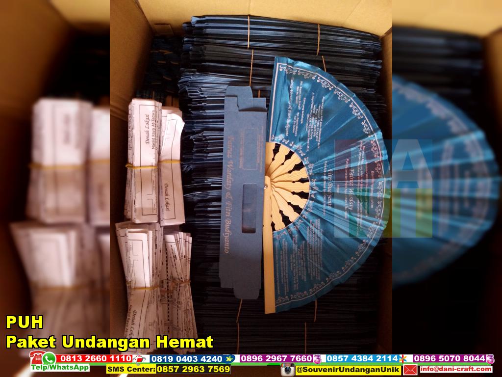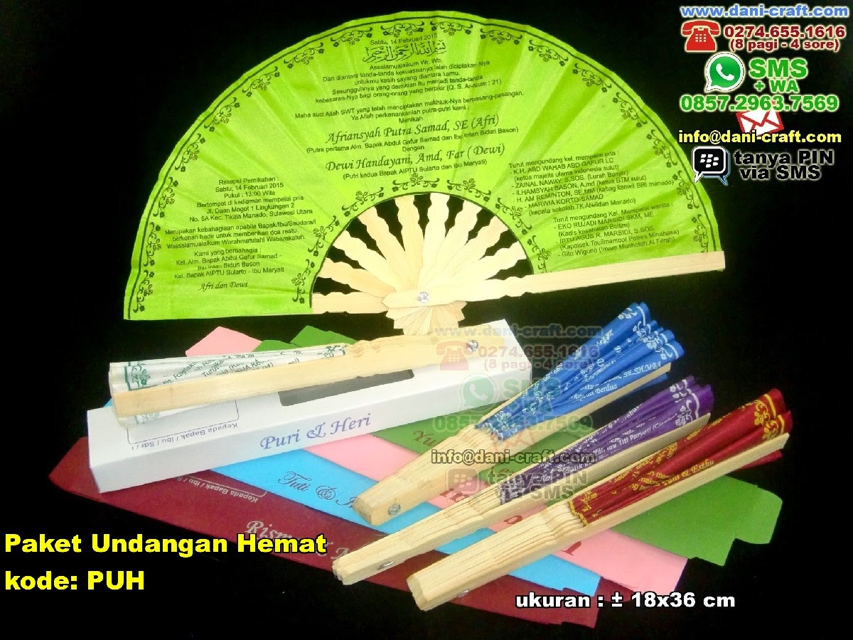 Kini, sebagai wujud layanan DANI-CRAFT kepada konsumen, kami tak hanya menghadirkan kualitas tapi juga konsep hemat pada undangan pernikahan. Konsep tersebut kami tuangkan dalam bentuk Paket Undangan Hemat (PUH). Paket Undangan Hemat (PUH) tersebut terdiri dari undangan kipas lengkap dengan kemasannya. Harga 3.100/pcs.