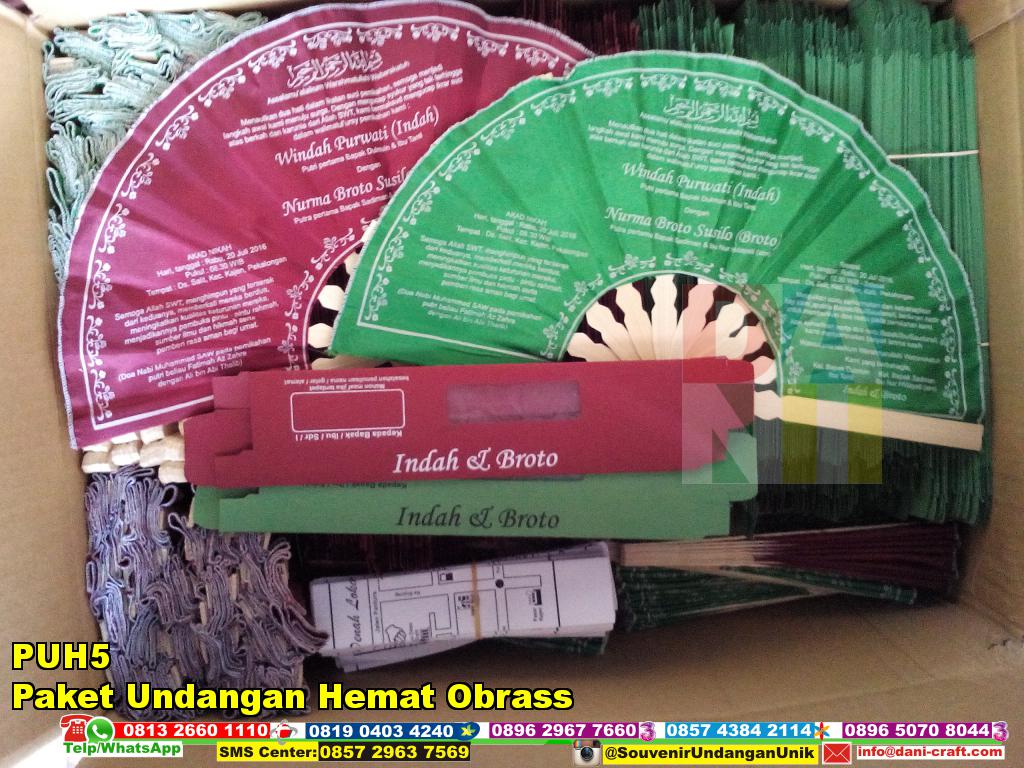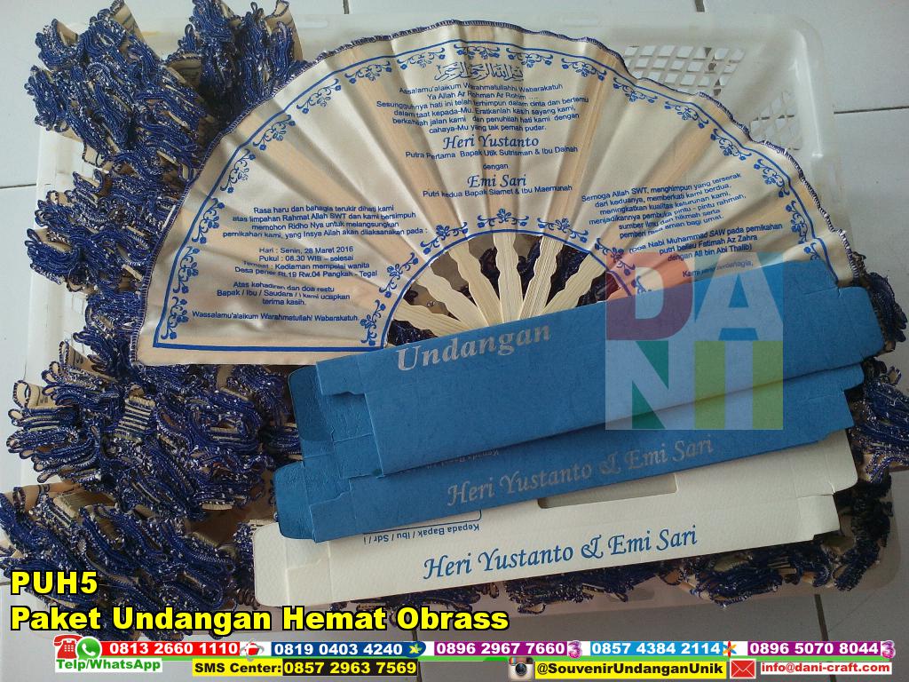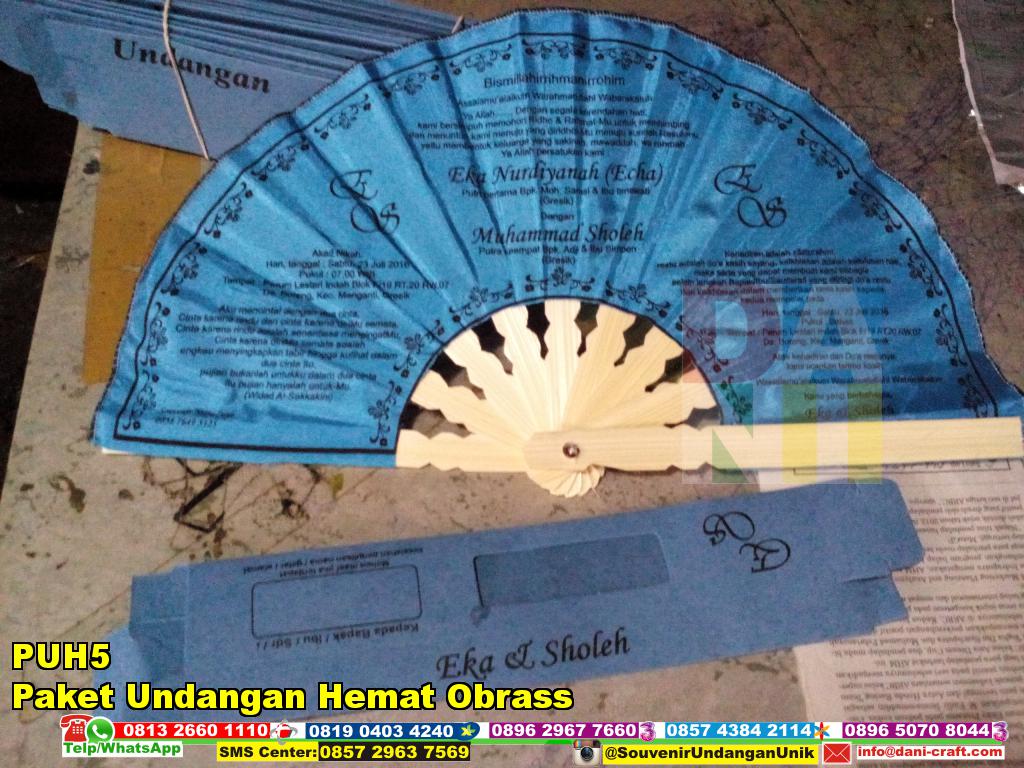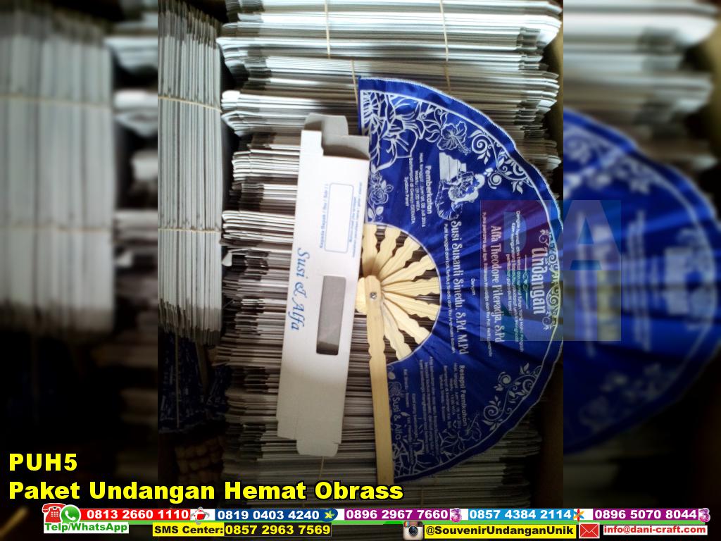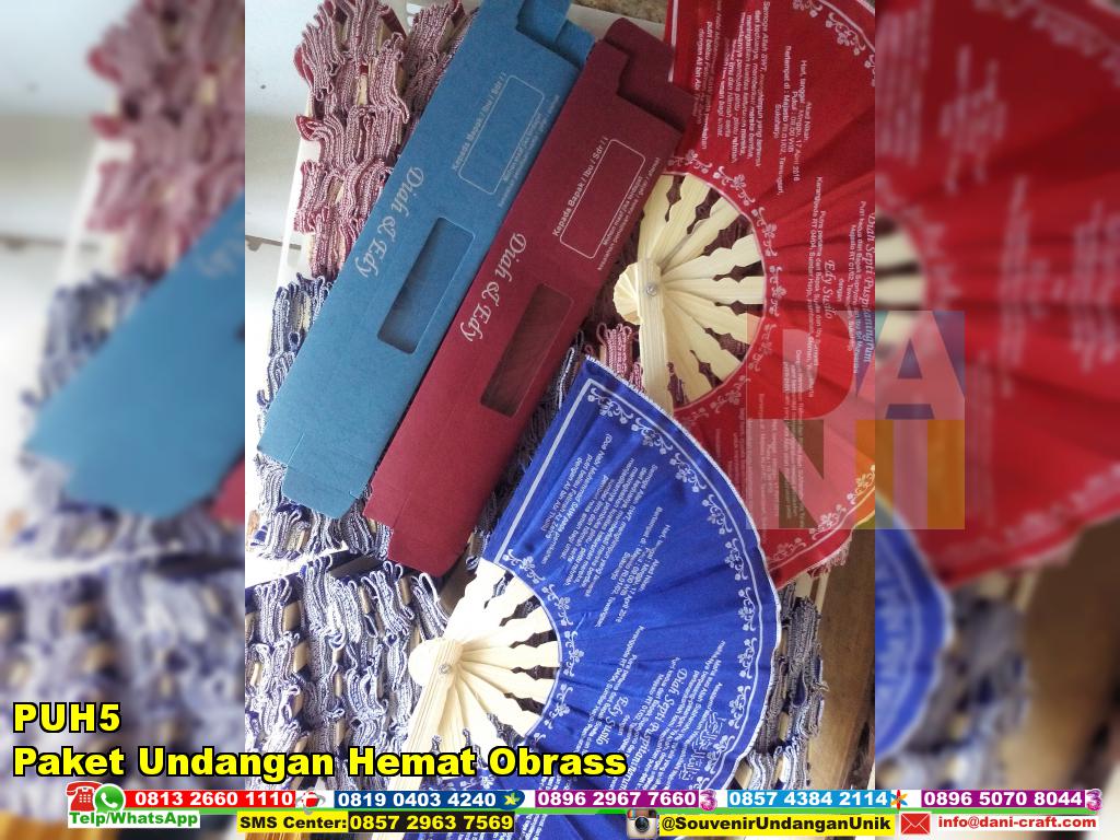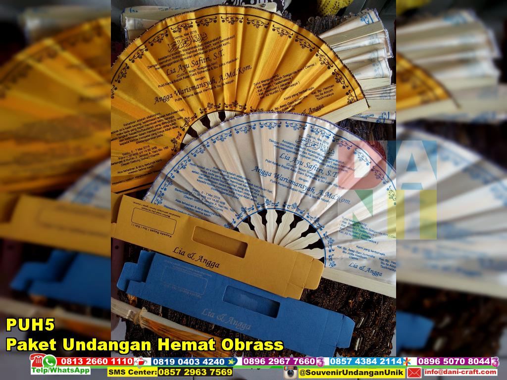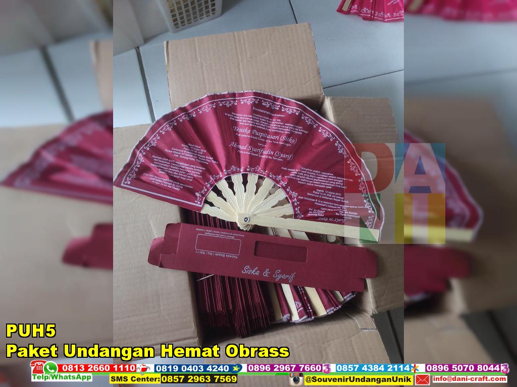 Undangan kipas murah ini memiliki banyak persamaan dengan undangan kipas murah dengan kode PUH. Mulai dari jenis kain yang dipakai, jenis rangka, sampai pada jenis kertas untuk kemasan juga sama. Perbedaan utamanya adalah jika pada PUH bagian tepi kipasnya di lipat, pada PUH5 ini bagian tepinya di obrass. Obrass adalah teknik finishing bagian tepi kain untuk membuat undangan kipas menjadi lebih unik. Perbedaan lainnya tentu saja adalah pada harga. Undangan kipas kode PUH5 ini harganya lebih murah, yakni Rp 3.000/pcs sudah termasuk kemasan kotak kertas.