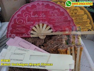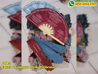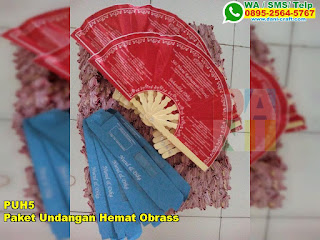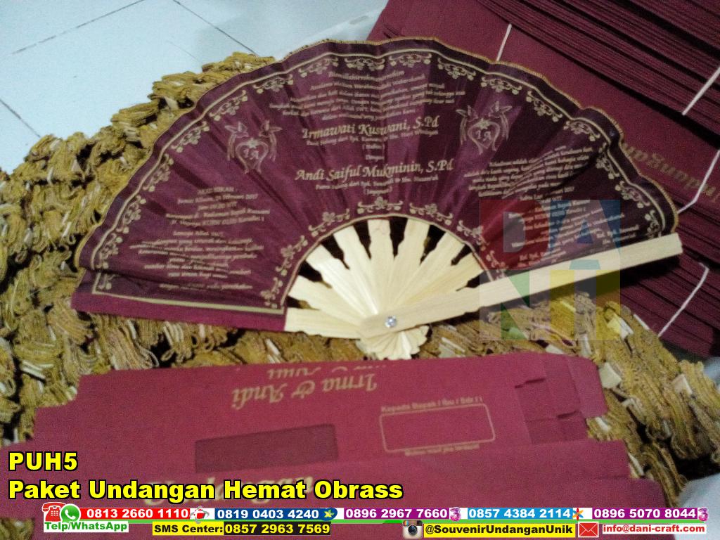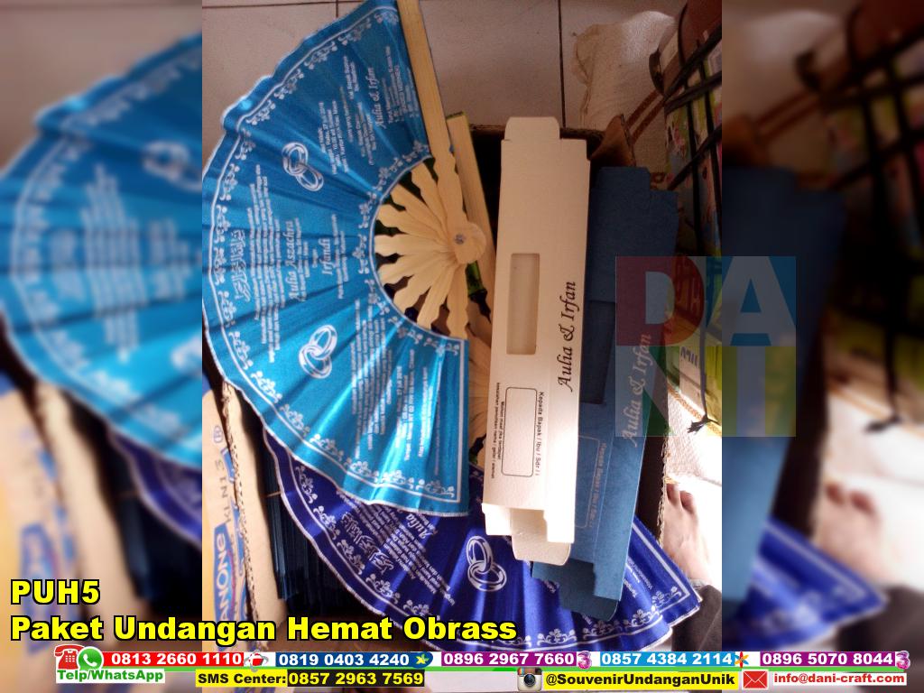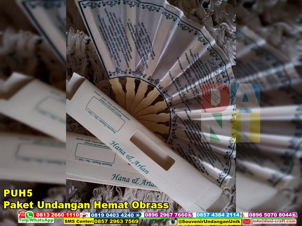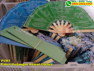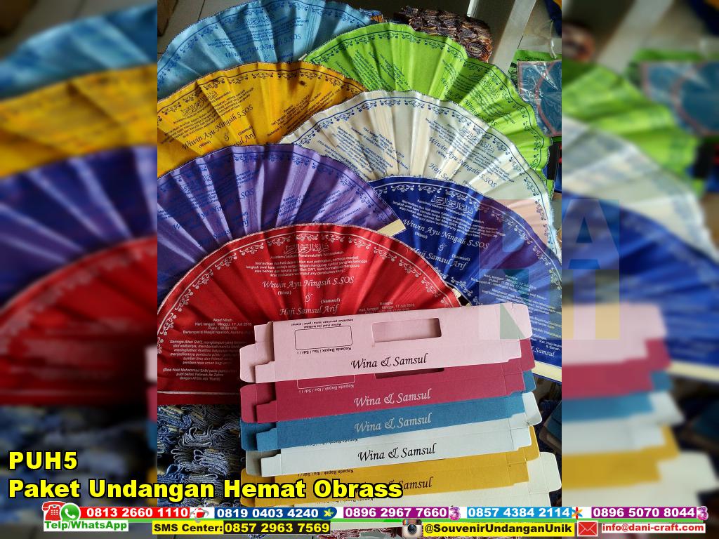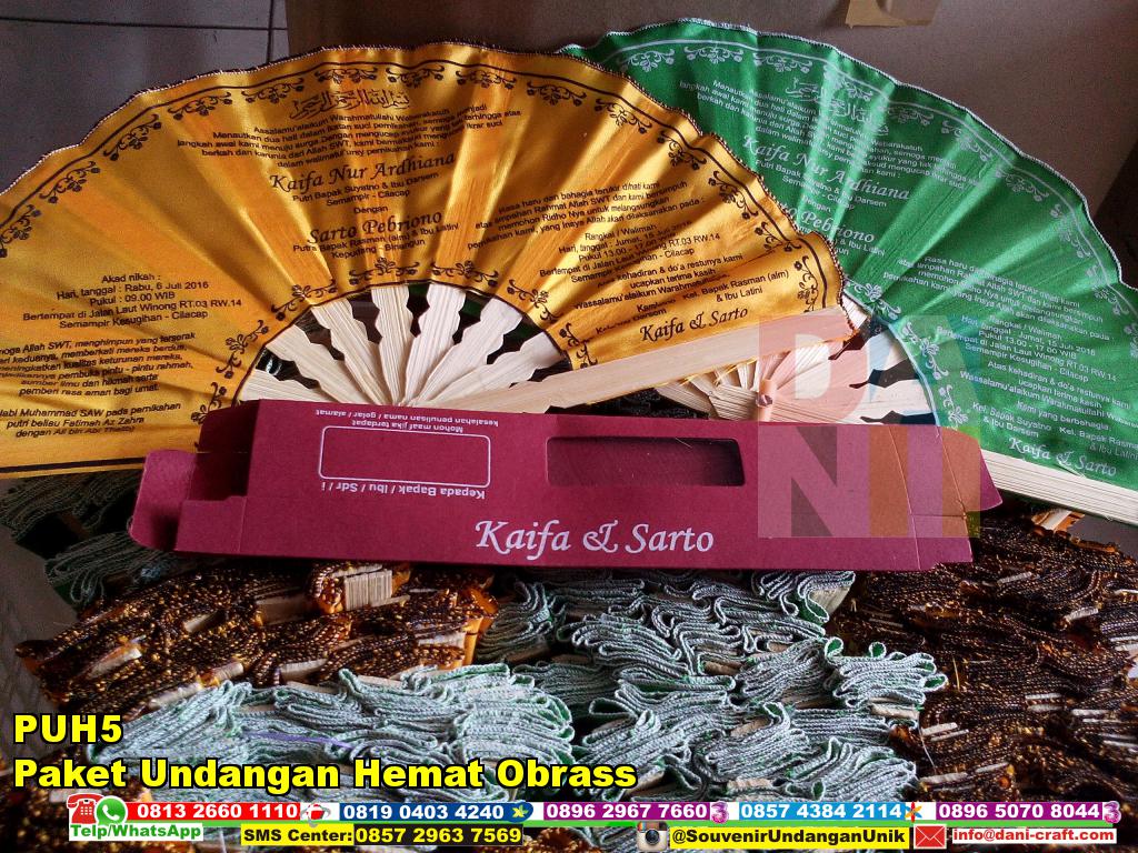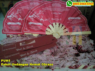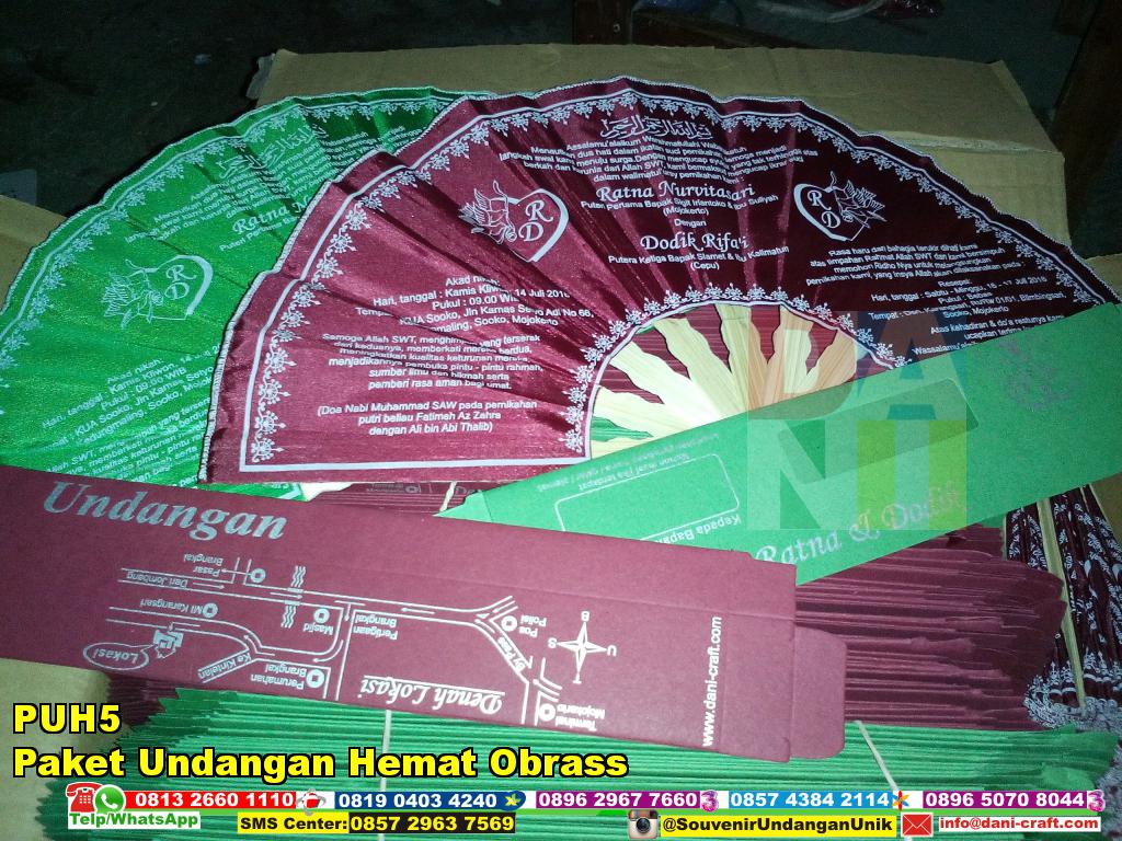 Undangan kipas murah ini memiliki banyak persamaan dengan undangan kipas murah dengan kode PUH. Mulai dari jenis kain yang dipakai, jenis rangka, sampai pada jenis kertas untuk kemasan juga sama. Perbedaan utamanya adalah jika pada PUH bagian tepi kipasnya di lipat, pada PUH5 ini bagian tepinya di obrass. Obrass adalah teknik finishing bagian tepi kain untuk membuat undangan kipas menjadi lebih unik. Perbedaan lainnya tentu saja adalah pada harga. Undangan kipas kode PUH5 ini harganya lebih murah, yakni Rp 3.000/pcs sudah termasuk kemasan kotak kertas.