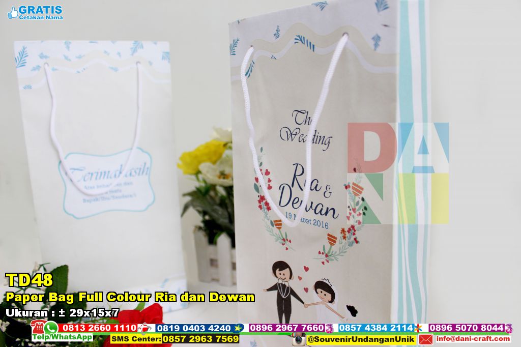 Toko Paper Bag Full Colour Ria Dan Dewan murah. Kode produk ini adalah TD48. Barang ini menggunakan material Kertas. Adapun ukurannya yaitu kisaran 29x15x7