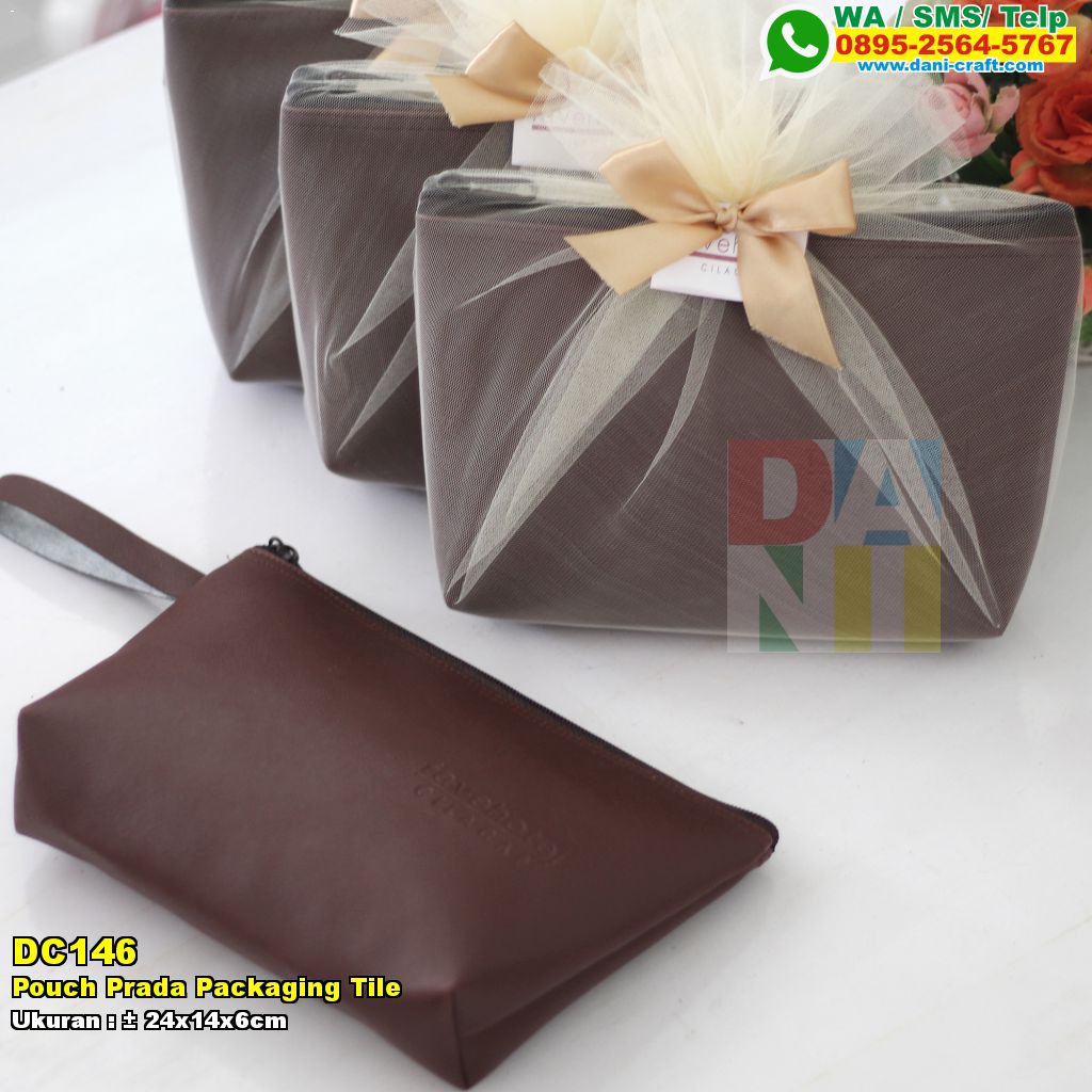 Toko Pouch Prada Packaging Tile murah. Kodenya barang ini adalah DC146. Produk ini memakai material prada. Adapun dimensinya yaitu sekitar 24x14x6cm