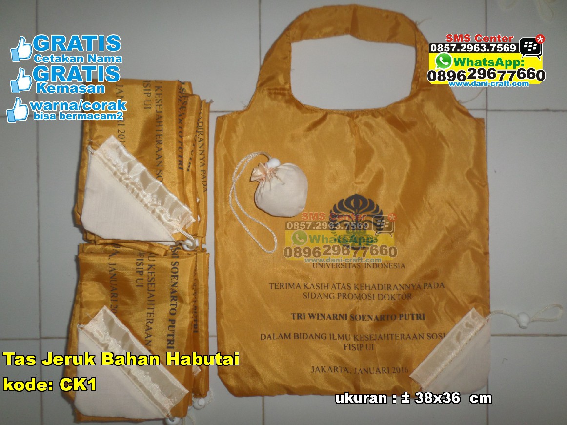 Tas jeruk ini bukan hanya sembarang tas lhoo, tas jeruk ini terbuat dari kain habuntal yang dikenal dengan ringan dan kuatnya, sehingga tas jeruk ini mudah dibawa dan ringan selain itu ringan pula. apakah tas ini berbentuk mawar tidak tas ini berbentuk tas pada umumnya yang berbenutk persegi dengan kantungnya serta gagang tas yang berlubang bulat. lalu kenapa dinamakan tas jeruk karena tas ini terdapat lipatan khusu juka dilipat maka akan membentuk bulatan dan mirip seperti buah jeruk. Unik kan Tas jeruk ini juga bibuat dengan berbagai warna ada yang berwarna merah, pink, biru sampai hijau. Selain itu tas jeruk ini juga dibuat dengan bahan bahan pilihan sehingga tas mawar ini tidak mudah rusak dan kuat. Tas jeruk selain dibuat dengan bahan pilihan dan melalui proses penyortiran tas jeruk ini juga dibuat dengan tangan tanga profesiaonal dan terlatih dengan memperhatikan detai detai pada bagian kecilnya seta penjaitanya pun dilakukan seacara berkala agar tas mawar ini menjadi lebih awet dan tahan lama. Dengan bahan yang berkualitas dan dikerjaan oleh tangan profesional anda tidak perlu khawatir lagi dengan kualitas dan Kelebiha dari tas ini, sudah terjamin. -- Aron Nur
