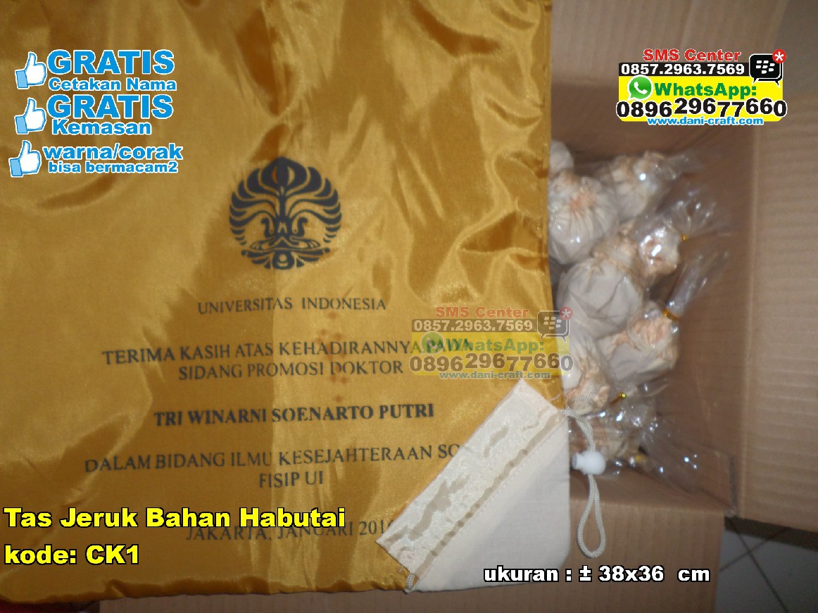 Kode CK1 Adalah Tas yg berbahan dasar dari kain habutai . Ukuran tas ini kurang lebih seperti yg ada pada gambar . Perlu anda ketahui bahwa tas ini dikemas sedemikian rupa segingga sangat simpel dan mudah untuk dibawa. Ketika anda memesan bisa memilih coraksesuai yg anda inginkan.