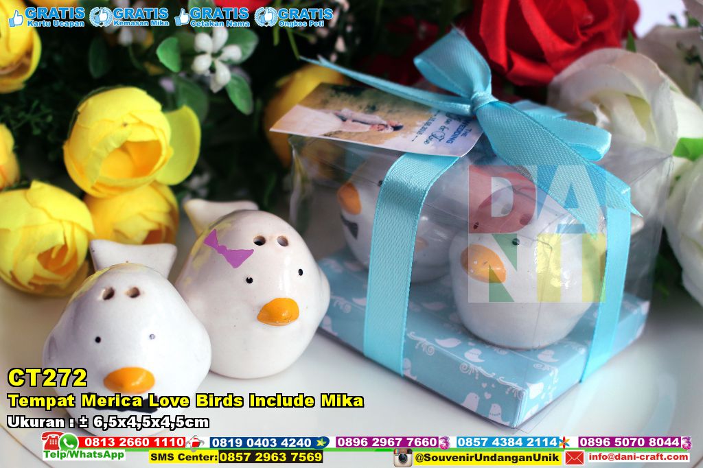 Anda bingung tentang suvenir pernikahan yang anda berikan kepada tamu undangan. Tetapi ingin yang unik, cantik, tetapi uang anda sudah berkurang untuk membiayai segala sesuatu untuk pernikahan tetapi masih kurang souvenirnya Tenang di sini soal harga jangan di kuatirkan harga mah tetap irit dompet Nih di sini solusinya Tempat mrica berbentuk love bird include mika merupakan salah satu dari barang atau produk yang ada di dani craft. Tempat mrica ini terbuat dari keramik yang berkualitas dan memiliki bentuk yang tidak biasa dari produk pada umumnya atau bisa di katakan berbretuk unik. Tempat mrica ini bisa berfungsi berbagai macam antara lain tidak hanya untuk wadah mrica tetapi dapat di gunakan untuk pajangan di rumah karena bentuk burungnya yang cantik dan menawan bahkan dapat di gunakan untuk mainan anak Apabila anda ingin mendapatkan souvenir seperti di atas, tinggal di pesan saja melalui telephone, whatsapp, bbm di atas sudah ada kontaknya kok, tetapi apabila anda kurang puas dengan pelayanan via telephone, whatsapp, atau bbm silahkan kunjungi saja websitenya di sini www. dani-craft. com di website itu bahkan terdapat berbagai macam produk yang unik dan cantik tetapi tetap murah, tetapi jika anda belum puas lagi dengan pelayanan yang ada di websitenya anda tinggal datang saja ke pemroduksinya di sini Jl Kasongan Dusun Tirto Kulon RT 04 Bantul Jogja 55184 dan di tokonya anda bisa memilih langsung dan bertanya tanya tentang produk yang anda inginkan dan tentunya anda mendapatkan pelayanan yang sangat nyaman di hati dan di dompet anda -- Rizal Nur