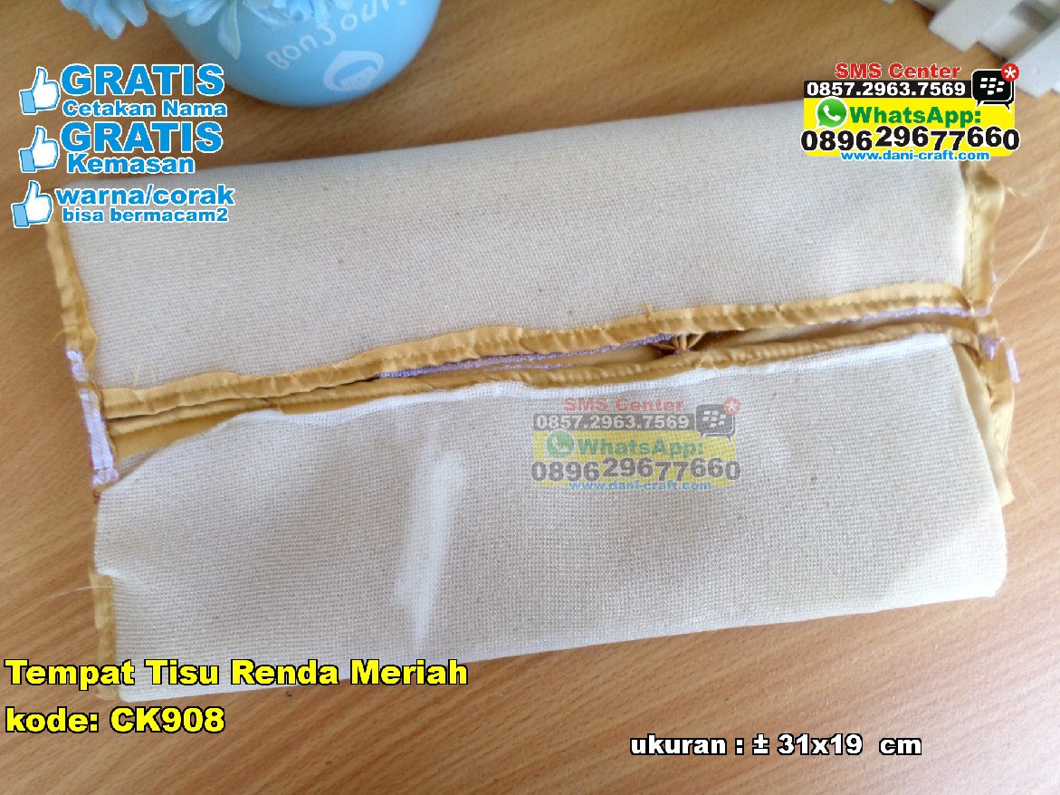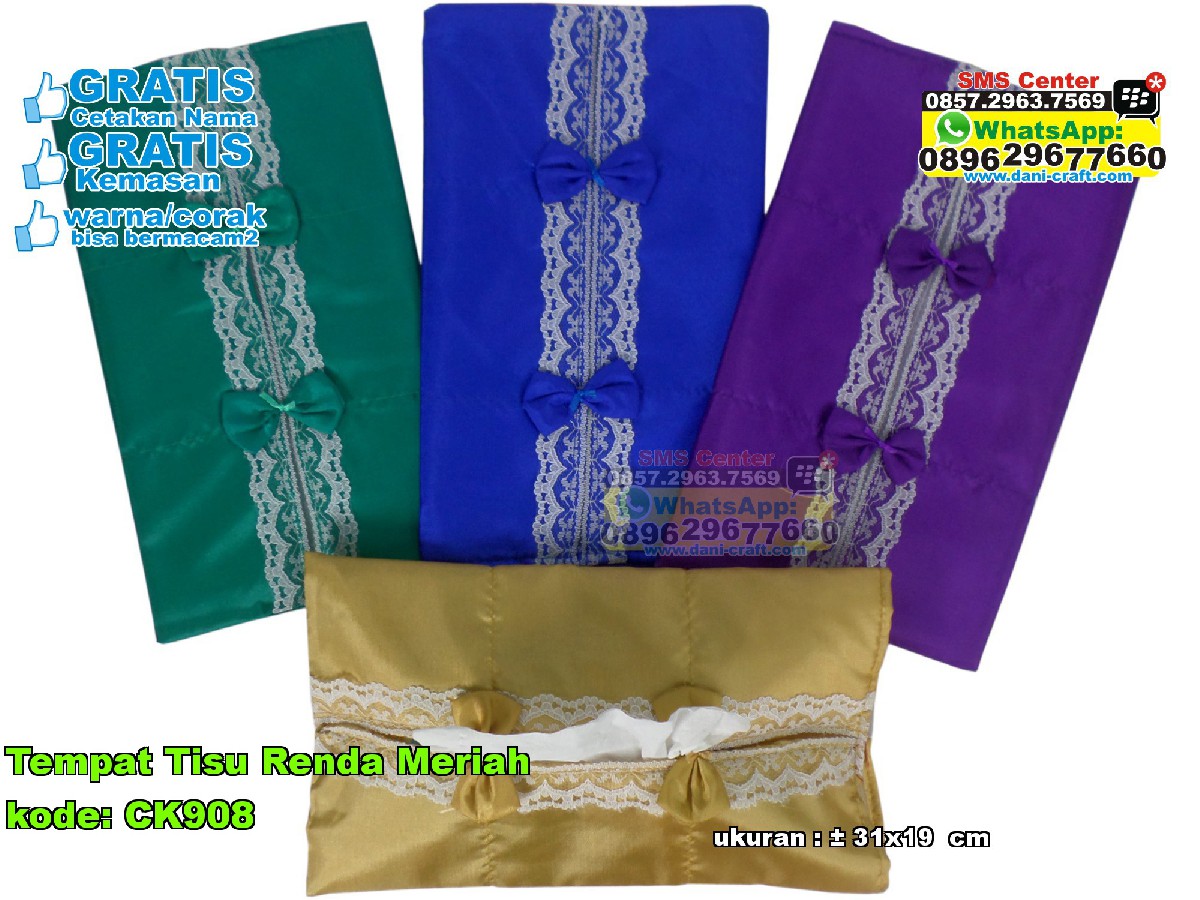 Tempat tissue renda meriah ini bisa menjadi rekomendasi jika ada dan pasangan anda akan atau ingin melangsungkan pernikahan sebagai souvenir atau buah tangan di pernikahan anda untuk para tamu. dengan macam macam warna tempat tisu ini sangat cocok utuk souvenir atauu buah tangan. dengan warna coklat muda ungu atau violet, biru, dan hijau. tentunya tempet tissu renda meriah ini sangat simple untuk di daruh di ruang tamu, ruang keluarga dan ruang tidur anda. dengan harga yang cukup terjangkau anda bisa memilih ini sebagai souvenir atau buah tangan untuk pernikahan anda. dengan ukuran kurang lebih berkisar tiga puluh satu kali sembilan belas ccentimeter ini sangat elegan. dan dengan di beri motif renda yang tentunya menambah kesan yang meriah dan daya tarik bagi anda atau orang orang yang akan membelinya. jika anda atau kalian ingin membeli atau memesan tempat tisu renda meriah inni anda bisa datang ke dani craft, di jalan kasongan dusun tirto kulon rt 04 bantul yogyakarta. anda tidak perlu ragu karena ini gratis cetakan nama dan gratis kemasan. -- Anggi Luthfiatul