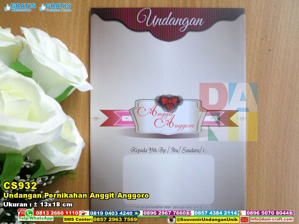 Toko Undangan Pernikahan Anggit Anggoro harga grosir. Kode barang ini adalah CS932. Barang ini memakai material Kertas. Adapun ukurannya yaitu kisaran 13×18 cm